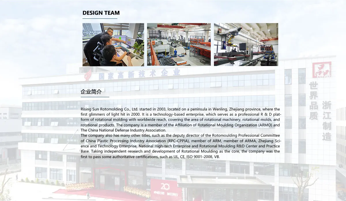 Wenling Rising sun Rotational Moulding Technology Co., Ltd was founded in 2003, located in wenling City, Zhejiang Province, which is closed to Ningbo and Shanghai, the company is specialized in the rotational molding machines, moulds and rotational product